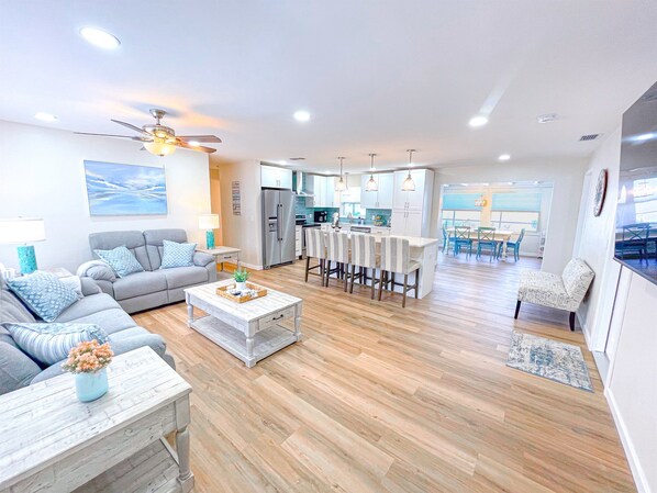 Bluetique is located just off the island with an 6 minute drive to Indian Shores/Indian Rocks Beach. The interior is designed for comfort and is equipped with a well-appointed and stocked kitchen for home-cooked meals. The living area is spacious and inviting for guests to gather for games or movies. The kitchen island has four seats so guests can gather and chat with the cook. The dining room table can expand to provide seating for ten and there is additional outdoor seating and a grill for al fresco dining.