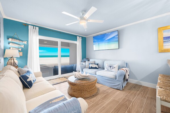 Unit 7 ON the Private Beach 1bd/1ba This one bedroom unit with full kitchen & patio leading to private beach features one king bed and pull out sofa comfortably sleeping four guests. The living room features a 50” Smart TV, sleeper sofa, and breathtaking Gulf views. We furnish linens, towels, toiletries, beach towels, beach chairs & gas grill for your use. Laundry room with coin operated washer and dryer available for use [$1.75 per load]. Free reserved parking included.