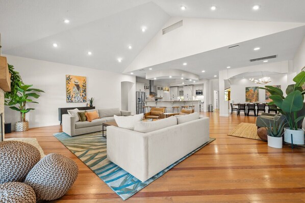 The Pine & Palms is a 5,500 sq ft group getaway just 3 minutes from Indian Rocks Beach, with a layout that works especially well for large families, multiple couples, and friend groups who want plenty of room to spread out.