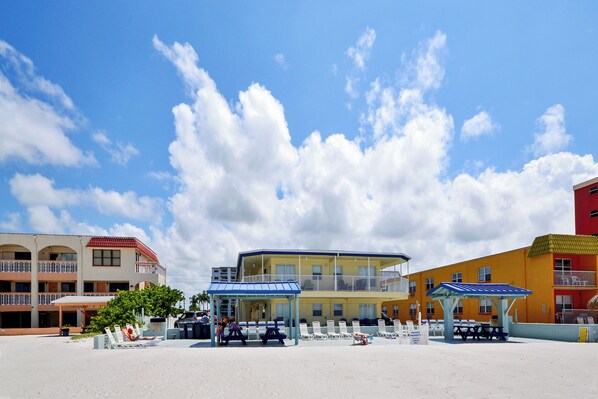 It was small, but for us it was perfect. Had everything we needed for a nice lil getaway. Clean, safe & beautiful Sunsets right off the balcony. Only 2 levels so easily accessible. I wish we would've had loungers & Umbrella Oceanside. Had alotfor our use, just not on the Sand, we purchased camping chairs at Walmart to carry Oceanside. I definitely would stay again!!