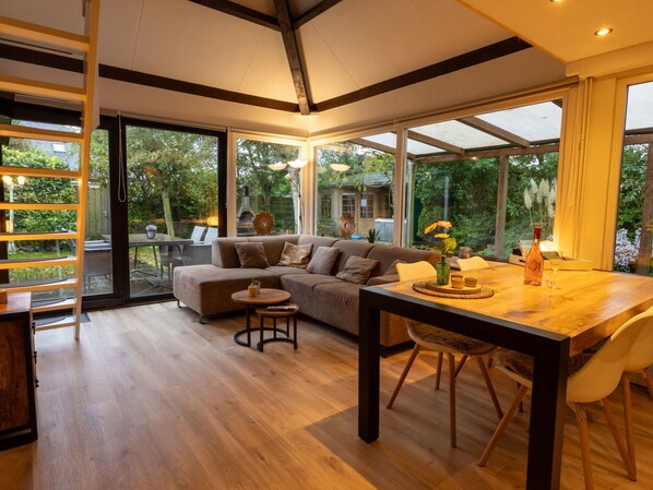The bungalow is suitable for up to four people. The open living room with a sofa is equipped with an LCD TV with 70 Channels including the most well-known 15 German channels, central heating and a dining area. The open kitchen has a Senseo coffee machine, filter coffee machine, kettle, microwave, dishwasher, fridge-freezer, induction hob and washing machine. The bungalow has a bedroom on the ground floor and a bedroom on the top floor. The downstairs bedroom is furnished with an electric Auping double bed (200 cm x 200 cm), while the upstairs bedroom is furnished with two 70 x 200 cm box-spring single beds. The bathroom is on the ground floor and features a shower (rain, massage and jets), a toilet and a sink.