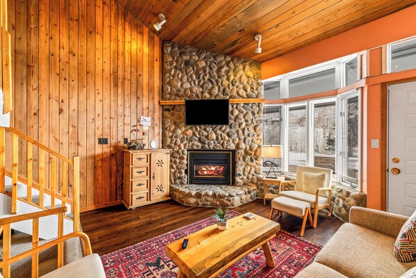 TV, fireplace - Cozy Loft Studio | Steps from the Slopes | Fireplace + Hot Tubs! (Steamboat Springs)