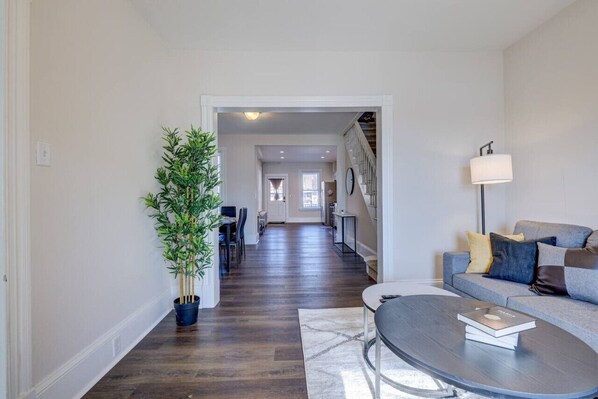Enjoy a stylish experience at this centrally-located townhome. Located in the heart of Stroudsburg, we welcome you to the poconos! 15 mins from Shawnee, 10 mins from The Crossings Outlets, 5 mins from Stroud mall, walmart, and many restaurants. 2 full kitchens is provided, 4 free parking spaces, 2 washers and 2 dryer, and 2 King suites! (1 in each unit)