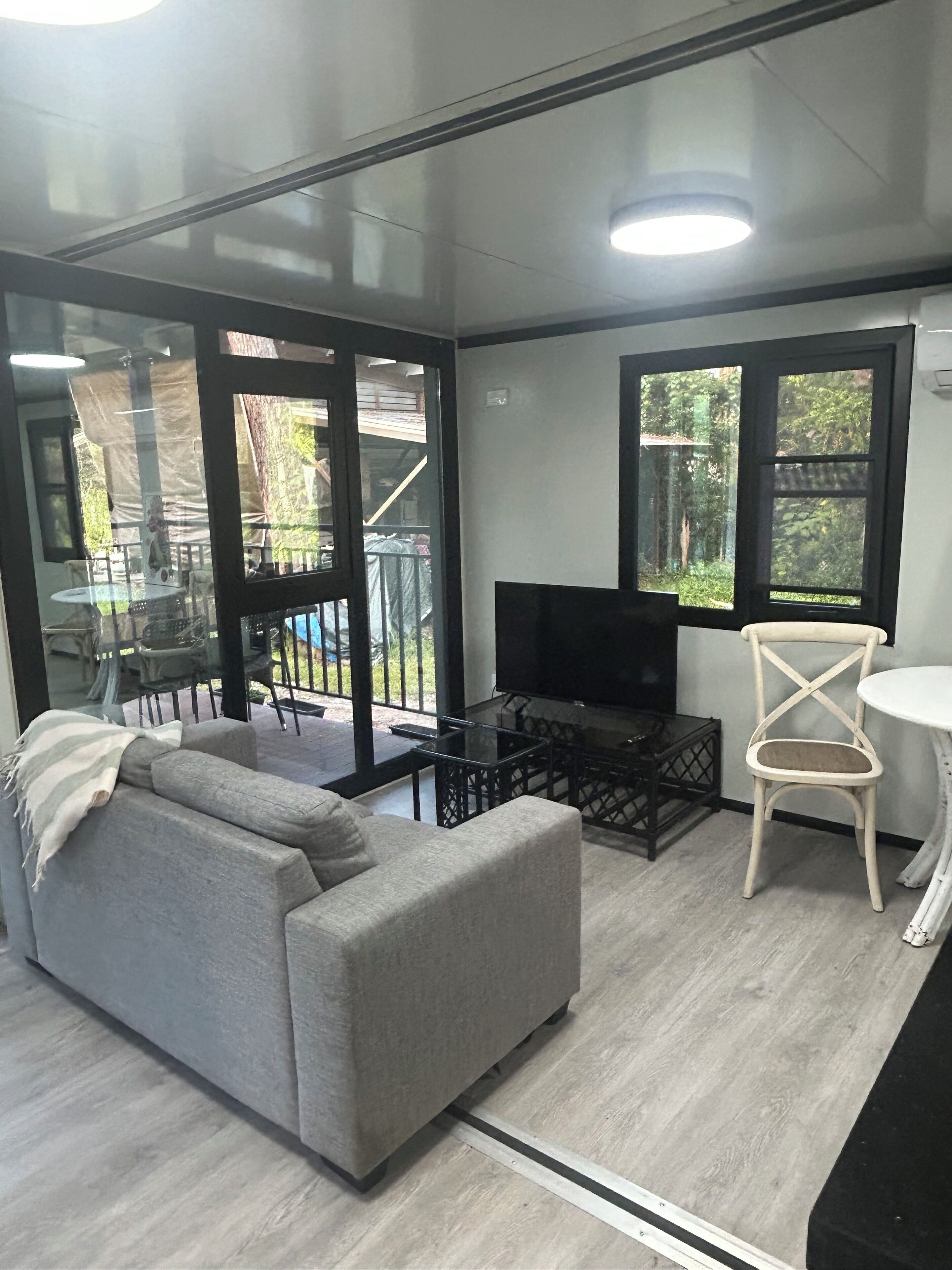 Travelers relax on a private deck with luxury seating or gather around an open fire pit beneath the stars in this peaceful Noosa Valley retreat.