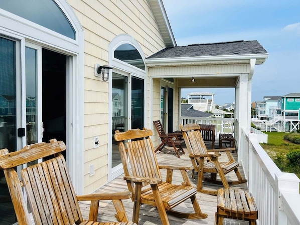 Experience Salt, Sand & Sudds, a beautifully maintained inverted home with stunning views of both the ocean and the Intracoastal Waterway. Located on a quiet street off the boulevard, this five-bedroom, three full bath, and two half bath home is perfect for large gatherings. The open floor plan features a spacious great room and a well-equipped kitchen, including two refrigerators for extra storage—no need for multiple grocery trips!