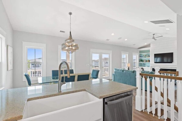 As you enter the top floor, you'll be greeted by an inviting atmosphere. The fully equipped kitchen is ready for you to prepare delicious meals, and the adjacent dining room and breakfast nook provide ample seating for everyone. The comfortable living area features a plush sofa and swivel armchairs, perfect for unwinding after a day of fun. The charmingly modern electric fireplace adds a cozy touch to the space.