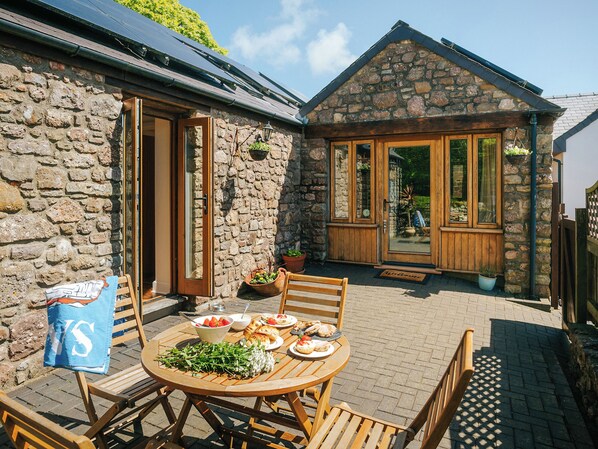 Bathroom: Bath With Shower Over, Toilet. Underfloor heating, electricity, bed linen, towels and Wi-Fi included. Travel cot and highchair. Enclosed rear garden with patio, garden furniture, barbecue, and children’s play equipment. Private parking. No smoking.. The cosy living room looks onto the patio area, ideal for little children and dogs to play. Beyond there is a well-equipped kitchen with a dining table for 4. The inner hallway leads to the bedrooms, nestled in the thick walls, with oak flooring throughout. The twin room is ideal for children. Open wide the second set of Patio doors in the master bedroom to watch white clouds skip across the clear skies and daydream of days spent lazing on the beach or hiking over the wild countryside. At night you will be amazed by the dark skies as stars twinkle and bats dart to and fro.