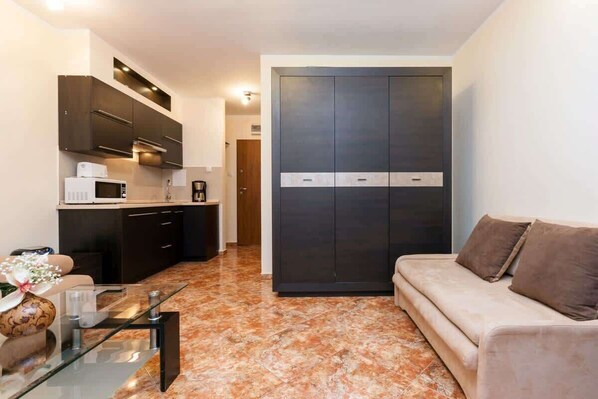 The studio apartment is the perfect place for guests who value comfort, independence, and a prime location. It offers self-check-in and check-out, allowing for complete freedom and convenience in planning your arrival at any time. Its convenient location guarantees quick access to the area's main attractions and amenities. The balcony is the perfect spot for a morning coffee or an evening of outdoor relaxation. Pet-friendly accommodations allow you to enjoy your stay with your pet for a small additional fee. For business guests, a VAT invoice is available for your stay, simplifying business formalities.