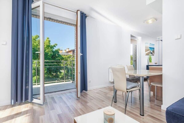The apartment can accommodate up to 5 guests (4 adults + children).The accommodation consists of a living room with a kitchenette, a bedroom and a bathroom. A spacious balcony provides additional relaxation space. The sleeping layout comprises a double bed in the bedroom, and a double sofa bed in the living room. At request, parents traveling with small children can be equipped with a cot and baby's high chair. The place is decorated in elegant cream tones interspersed with bronze elements. The true charm of this holiday rental is its functionality and catering to the needs of guests. Comprehensive kitchen facilities include an induction cooktop, a microwave, a coffee maker and a toaster. Entertainment amenities offer a free Wi-Fi network and a cable TV with access to German and Polish channels. For a good start, a welcome package with toiletries, towels and linens is provided for guests.