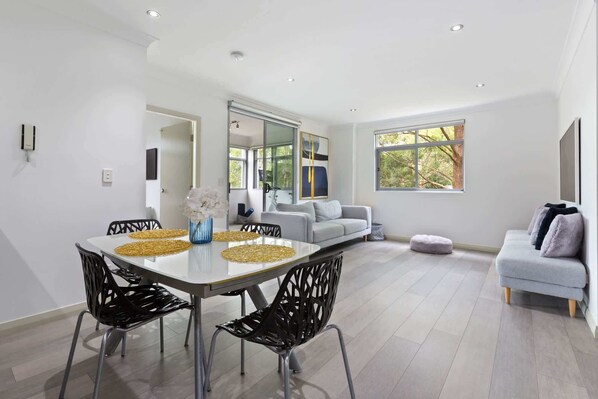 The modern kitchen features gas appliances, generous bench space, and a full suite of cookware, perfect for preparing anything from a quick breakfast to a shared dinner. The adjoining dining area seats six comfortably, creating a central space for meals or conversation.