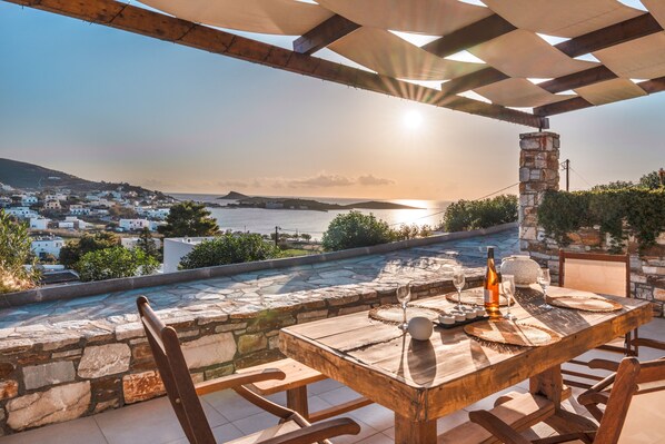 With a view of the sea, the holiday home Mont' Rock villas 3 in Ποσειδωνία Σύρος is perfect for a relaxing holiday. The 45 m² property consists of a living room, a well-equipped kitchen, 1 bedroom and 1 bathroom as well as an additional toilet and can therefore accommodate 4 people. Additional amenities include Wi-Fi, a smart TV with streaming services, air conditioning as well as a washing machine. A baby cot and a high chair are also available.