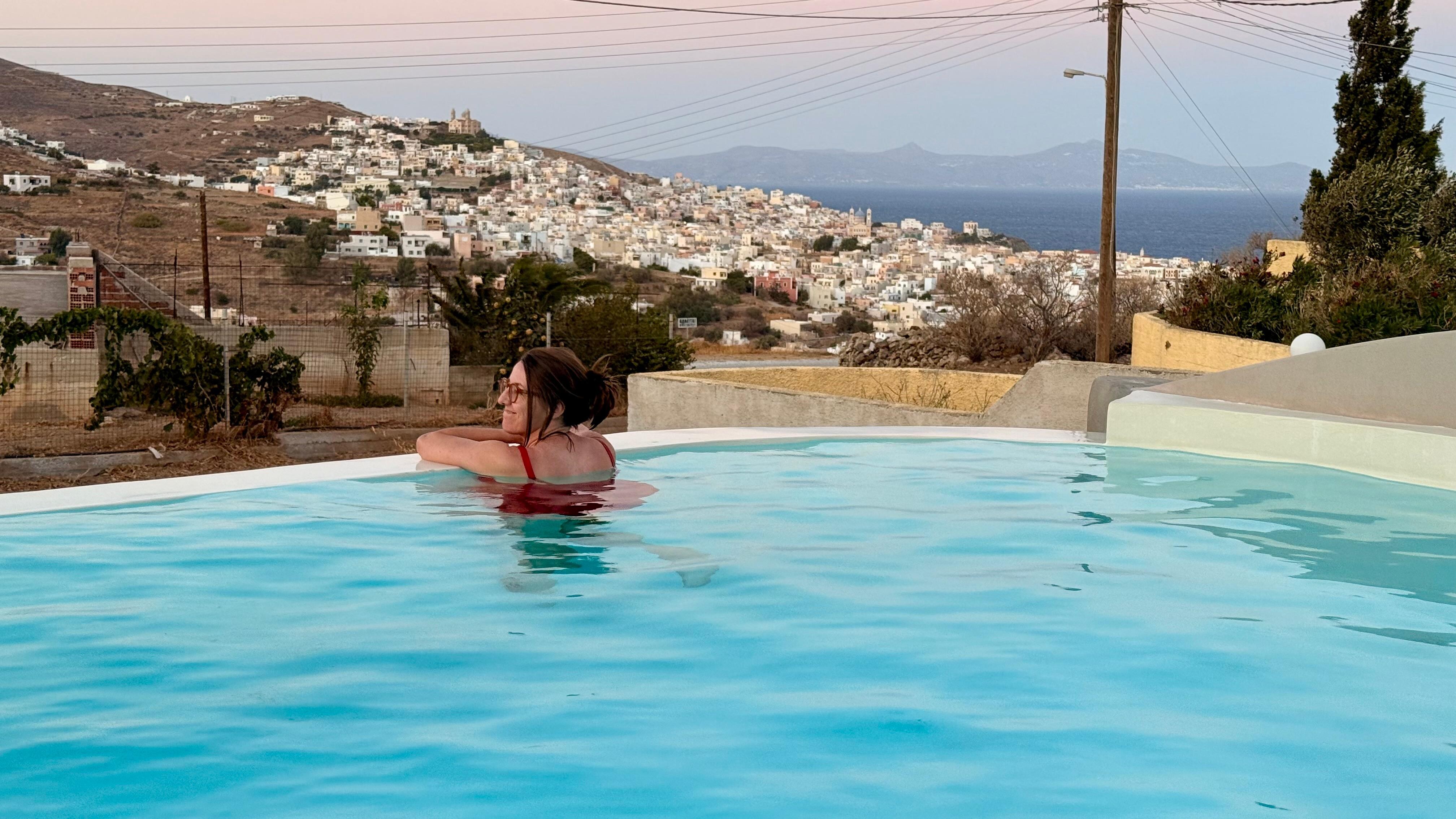Don’t think twice. Book this property! Ioannis is an exceptional host who will help unlock everything Syros has to offer. We stayed four nights in September and had a memorable and pleasant stay. The property is at the top of a hill overlooking the city with magnificent views during the daytime and at night with the city lit up and each church shining brightly. The pool is chilly but refreshing on a hot sunny day. Our room was spotless and contained everything we needed. Comfortable bed and pillows. A/C works great. Neighborhood is quiet (save for a neighborhood rooster) and safe. We didn’t try the bus system and appreciated having a scooter to get around. Be careful on the busy and slick roads. We had a spill on our scooter and Ioannis went above and beyond to attend to us. Overall, I can’t recommend this place enough. You will have an amazing stay here.