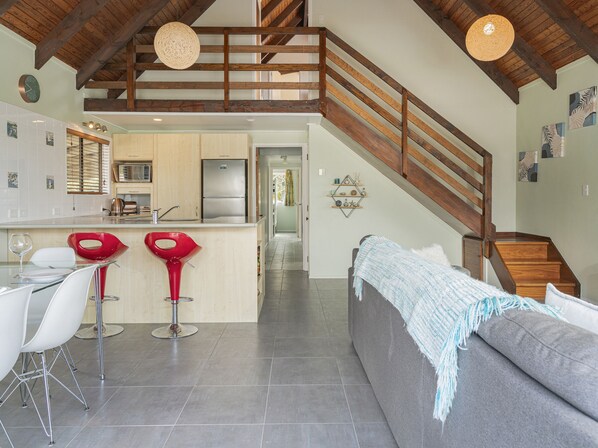 The open plan living space seamlessly connects to a north-facing, sun-drenched deck, perfect for indoor-outdoor entertaining, dining al fresco or as a base for your adventures.