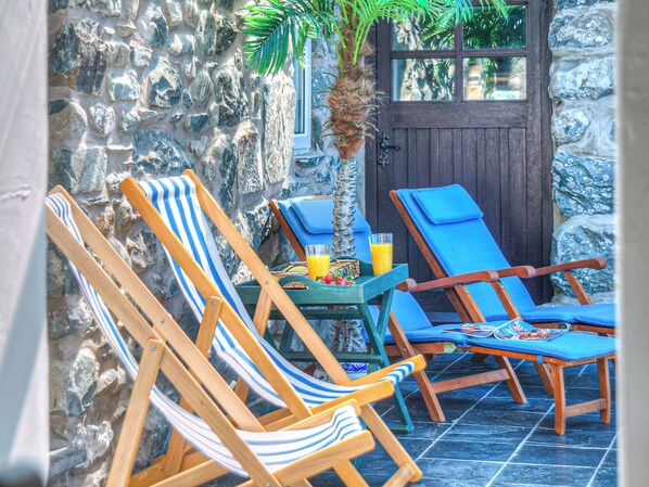 Slightly rustic in style with heavily curtained doorways separating the rooms. The small sitting room has lots of lamps and a wood burner ready to light; just strike a match when you arrive for a cosy, warm retreat. The delightfully creative use of an upturned hay basket makes an ideal pan rack in the pretty pine kitchen, with exposed beams and stone wall. The long sun lounge has floor to ceiling glass walls - lovely in spring and summer time. The elevated patio at the front has pub-style picnic table and benches; an ideal spot from which to enjoy the views across small stone-walled fields leading down to the sea.