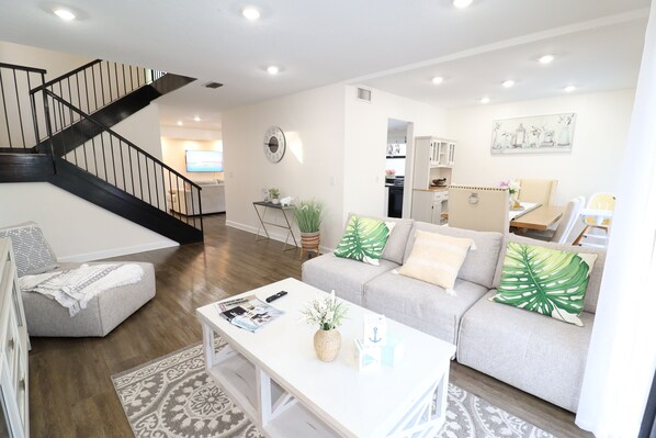SLEEPING - Master Bedroom - Queen Bed and TV, enormous dressing closet and a suite bathroom equipped. (Overlooking the backyard and the pool) - Bedroom Guest: Two Queen bed - Bedroom Guest: One Queen bed and one Twin bed - Bathroom Shared between Bedroom 1 and 2 COMMON SPACES - Living Room - With smart TV connected to internet with Netflix, and Contemporary and stylish Couch, each oversized seat has a smooth adjusting back mechanism for customizable seat depth making it the perfect place for entertaining friends or relaxing with family. - Family Living Room - One large sofa (very comfortable) and smart TV connected to the internet with Netflix. - Kitchen: Stocked & equipped for cooking & dining, with four element stovetop and a oven, fridge & freezer, microwave, dishwasher, disposal, toaster & coffee maker. - Laundry Room: Private in-unit washer & dryer available for use.