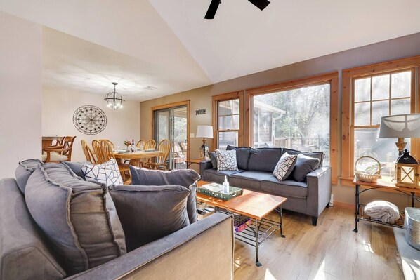 The bright and airy kitchen is fully equipped with all the appliances, utensils, and cookware you need to feel right at home. This thoughtfully designed space also includes a washer and dryer conveniently located just off the kitchen. The dining area seats 8 guests around a beautiful wooden table, with additional seating for 3 at the breakfast bar.