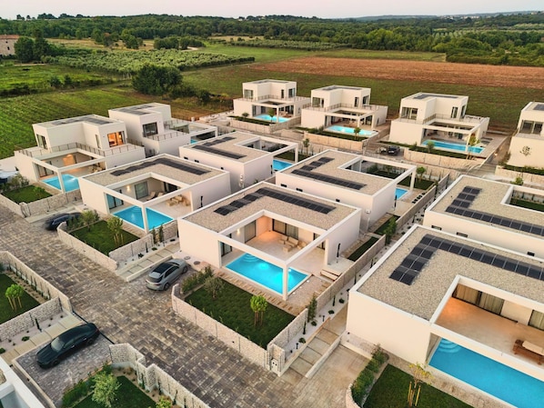 With 23 private villas, Taria feels like an intimate seaside village, with concierge service, à la carte dining and peaceful paths leading to the sea. Taria offers privileged access to several natural beaches, just a short walk away. Its ideal location provides endless opportunities to explore the richness of Istria and the charming village of Tar, famous for its culinary traditions, premium wines and picturesque cycling routes. Resort "Taria", built in 2025. 23 houses in the resort. 3 km from the centre of Tar, 10 km from the centre of Novigrad, 11.5 km from the centre of Poreč, 400 m from the sea, 400 m from the beach. Private: property, garden, swimming pool angular (depth 145 cm, seasonal availability: 01.May. - 01.Oct.) with internal staircase. Outdoor shower, pool maintenance by the owner/gardener. In the house: reception, restaurant, internet access. Parking on the premises. Bus stop 350 m, sandy beach 400 m, diving center 2 km. Golf course 13 km, minigolf 2 km. Nearby attractions: Aquapark 16 km, Padel 5 km, Adrenalin park 3 km, Go-kart, quad track 3 km. Please note: airfield 31 km from the property. The photograph shows a typical example. "Tranquillo", 4-room villa 137 m2. Living/dining room with panoramic window with satellite TV (flat screen). Exit to the terrace, to the swimming pool. 1 room with 1 french bed (200 cm, length 210 cm), bath/WC. 1 room with 1 x 2 bunk beds (120 cm, length 210 cm). 1 room with 1 french bed (200 cm, length 210 cm), shower/WC. Open kitchen (dishwasher, 4 induction hot plates, kettle, microwave, electric coffee machine, cooking island). Shower/WC. Terrace 42 m2. Terrace furniture, deck chairs. View of the swimming pool. Facilities: safe, hair dryer. Internet (WiFi, free). Please note: non-smoking house. Maximum 1 pet/ dog allowed.
