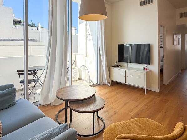 Furnished living room with access to the balcony. Quiet balcony with a bistrot table and 3 chairs.