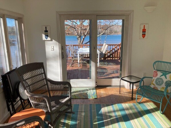 An expansive deck is the heart of the home, where you can grill, sip a drink, and watch boats pass as the sun sets. A bright sunroom offers a cozy space for reading, games, or conversation.
