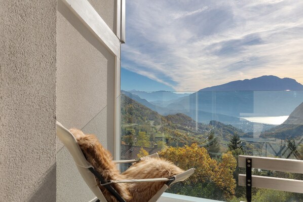 Room 306 on the second floor of Eco Del Garda in Tenno offers 26 m² for up to 2 guests. The room features a king-size bed, bathroom with shower, and a private covered terrace with breathtaking views of Lake Garda.
