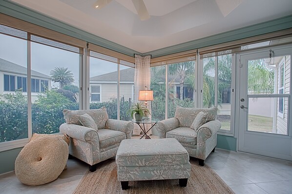 Relax in this charming beach cottage-style home with an open floor plan, perfect for entertaining. Enjoy the private patio with outdoor TV and hot tub, lounge on the outdoor patio swing/lounger or take a dip in your own screen-enclosed solar heated pool complete with waterfall and night lights.