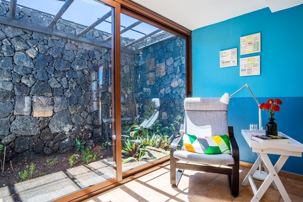 Embedded in the tranquil scenery of the town of Tías, just a short drive from the sandy beaches of Puerto del Carmen, the charming holiday home Villa Jupe impresses guests with its terraces and lush garden. The rustic holiday home with colorful accents consists of a living/dining room with a sofa bed (suitable for children up to 12 years old) and an integrated, well-equipped kitchen, one bedroom with 2 single beds as well as one bathroom and can therefore accommodate 2 people. Additional amenities include Wi-Fi, a washing machine as well as satellite and cable television. In the fenced, outdoor area you will find a lush garden with tall trees and open terrace with a dining table and umbrella. Read a good book under the afternoon sun while you absorb the views of the sparkling ocean in the distance and the surrounding mountain landscape. There is additionally covered barbecue area with a table and colorful paper lanterns, which create a cosy holiday atmosphere. Here you can round off romantic evenings with delicious meals and a regional glass of wine. You will find a supermarket as well as shops, restaurants, bars and cafes in the centre of Tías, which is 900 m or an 11-minute walk away. Furthermore, the famous beaches of Puerto del Carmen, which count among the most beloved, sandy beaches on the island of Lanzarote, are about 4 km or a 6-minute drive away.