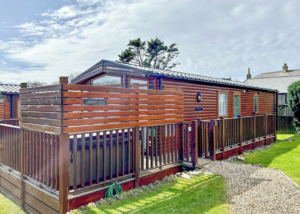 Modern holiday home with one double and one twin (with 2ft 6in beds). Shower. well-equipped lounge/kitchen/dining area. Decking with outdoor hot tub. Adjacent parking. Cot in lounge only.