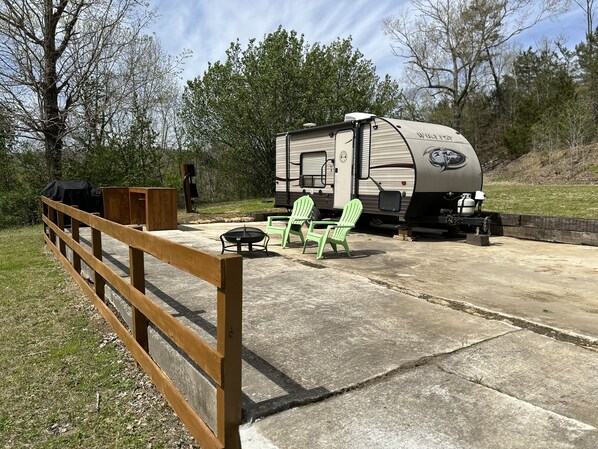 Quiet location away from the city but only a 5 minute drive to multiple dining/drink options and golf course, 15 minutes from Cloudland Canton state park, known for it’s amazing waterfalls and miles of hiking. Situated on a large concrete slab with ample parking for your vehicle... View of surrounding mountains during the day and nightly unobstructed view of the stars... Property features an outdoor dining area and grill as well as lounge chairs to enjoy the outdoors and relax...