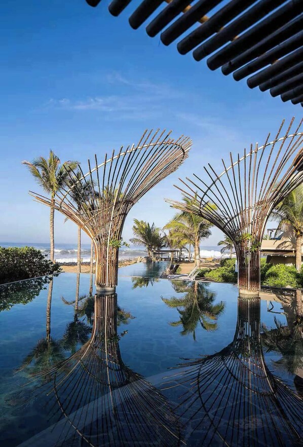 Experience the perfect blend of modern comfort and natural serenity in this spacious one-bedroom, oceanfront end-unit, located within a luxury development. Designed for two adult guests, this organic, tastefully styled condo offers an intimate and sophisticated retreat in one of the quietest and most desirable areas. Perfect for couples, digital nomads, or travelers seeking peace, privacy, and high-end living, this eco-conscious unit only uses health-friendly products and offers on-site recycling and compost receptacles. -Living room and primary suite with natural cross ventilation, as well as air conditioning, in a modern organic design -Private balcony with grille, dining table and private plunge pool overlooking lush grounds and the ocean break
