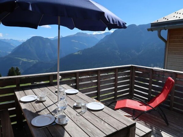 "Maiensäss Superior", 3-room chalet 58 m2, south-east facing position. Comfortable and cosy furnishings: living/dining room with 1 double sofabed (140 cm, length 200 cm), Scandinavian wood stove and satellite TV (flat screen), radio. Exit to the terrace. 1 double bedroom. 1 room with 2 beds. Open kitchen (oven, dishwasher, 4 ceramic glass hob hotplates, kettle, electric coffee machine, Capsules for coffee machine (Nespresso) extra). Shower, sep. WC. Electric heating. Terrace, south-east facing position. Terrace furniture. Very beautiful view of the mountains, the valley and the countryside. Facilities: safe, children's high chair, baby cot (extra). Internet (WiFi, free). Parking at the house. Suitable for families. Maximum 2 pets/ dogs allowed. Heating wood (as required/extra). Please note: Pets must be registered when booking. Aclas Heinzenberg SA only has a limited number of such pet houses. If pets are not registered in advance, the landlord cannot guarantee that a house will be available on site.