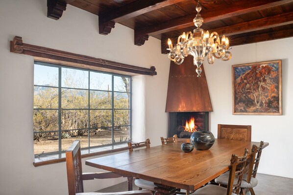 Enjoy modern comforts like high-speed internet, HD TV, and vintage Italian road bikes. Architectural highlights, including a kiva fireplace, wooden ceilings, hand carved door, hand-plastered walls, and polished concrete floors, blend history with connectivity. Immerse yourself in Tucson's past while savoring every contemporary luxury at Bolsius House.