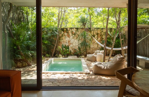 The private patio includes a small pool surrounded by native plants, creating an outdoor space suitable for resting.