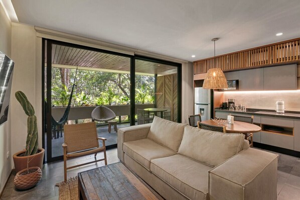 A well-designed one-bedroom, one-bath studio unit with a king-size bed, a sofa sleeper, and a balcony. We're located in a gated community at the heart of Tulum. With excellent views of greens and jungle. We offer very comfortable luxury condos.