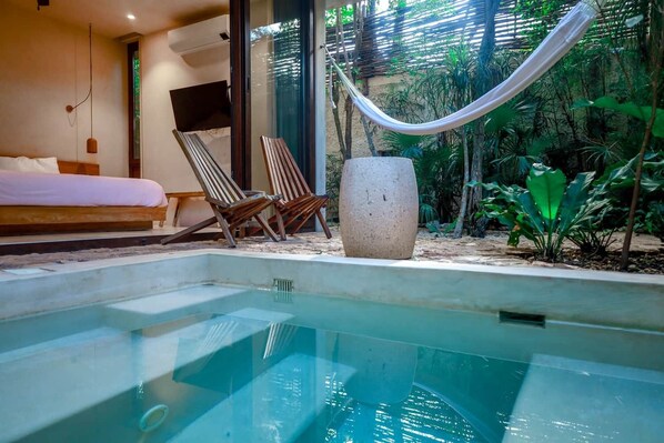 The private patio incorporates a small pool surrounded by plants from the local environment, forming an outdoor area that feels simple and quiet.