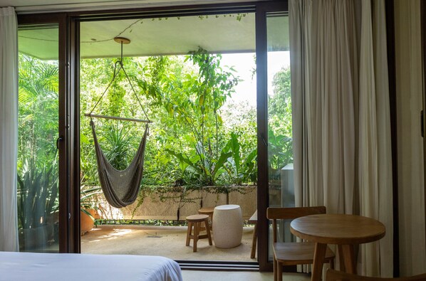 In the heart of Aldea Maya, TEVA 3b apartment offers a serene retreat with a private plunge pool and lush terrace. Surrounded by jungle views, high ceilings, and handmade furnishings, this apartment creates a peaceful atmosphere. Unwind in the relax chairs or explore our amenities including an outdoor pool amidst the jungle foliage.