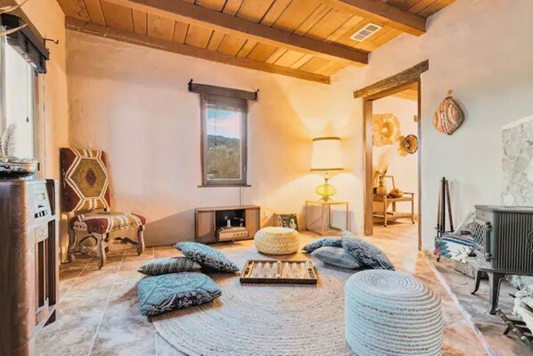 ✺ ABOUT THE SPACE ✺ • Original 1930's adobe structure and columns • 100% Solar-powered home • Main house features one master bedroom, with a comfortable queen size Japanese platform bed