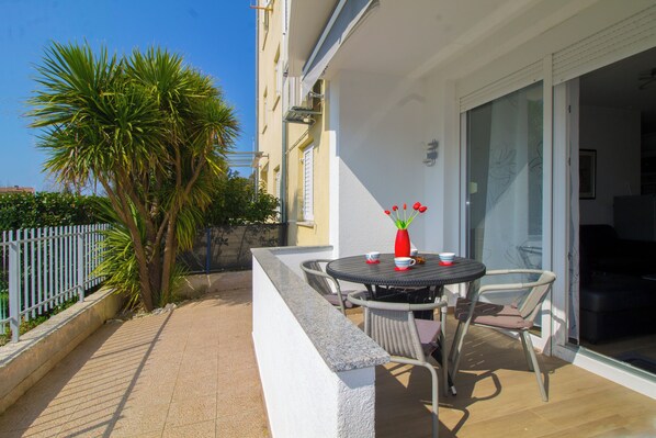 This one-bedroom apartment on the ground floor of a building comes with a fantastic terrace that offers a private outdoor space to relax and entertain. The terrace is accessible directly from the apartment's living area, which is bright and airy, thanks to the large windows that let in plenty of natural light. The living area is designed with an open concept, making it easy to move around. Located on the ground floor, this apartment offers easy access to the outdoors, making it perfect for anyone who enjoys spending time outside. The terrace is a great place to enjoy a cup of coffee in the morning or a good glass of wine in the evening. Overall, this one-bedroom apartment with a terrace is the perfect place for anyone looking for a comfortable and convenient holiday space. The apartment features a cozy bedroom with a comfortable king size bed, making it perfect for a couple or a single person. The bedroom also includes a closet for storage, ensuring that there is ample space for clothes and personal belongings. The bathroom features a shower, sink, and toilet, and it is conveniently located near the bedroom, making it easily accessible. The kitchen is fully equipped, making meal preparation and cleanup a breeze. The living room includes comfortable seating that opens up into a bed for two extra guests, a coffee table, and a flat-screen TV, providing the perfect space to relax after a long day. Located on the ground floor, this apartment offers easy access to the outdoors, making it perfect for anyone who enjoys spending time outside. Overall, this one-bedroom apartment with a terrace is the perfect place for anyone looking for a comfortable and convenient living space.