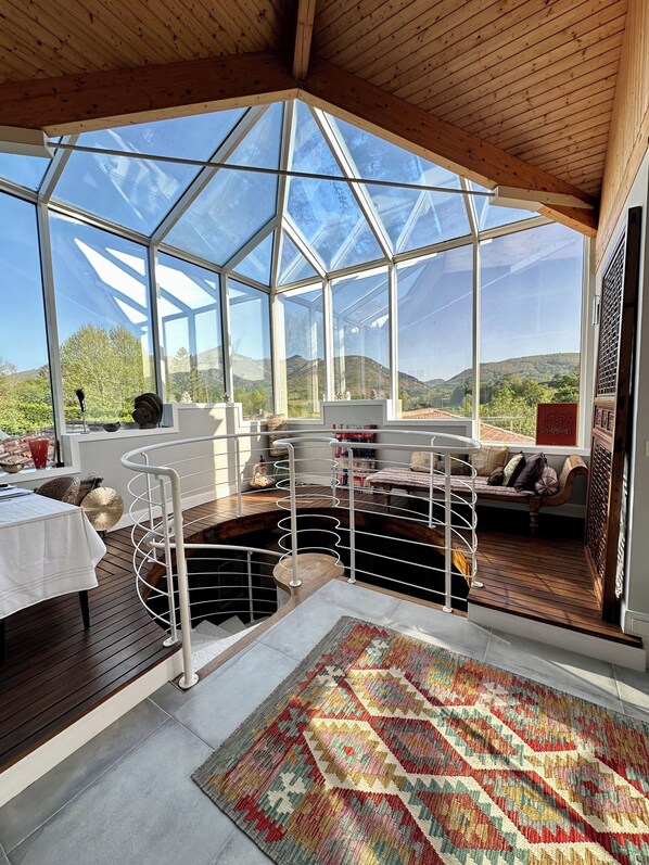 From the moment you enter, the architecture creates a unique sense of seamless indoor-outdoor flow thanks to the large bay windows that frame a spectacular view of La Rhune mountain. Your gaze is drawn to the surrounding nature, the garden, and the swimming pool. The silence, the light, and the clean lines of the architecture create a soothing atmosphere, ideal for relaxing with family or friends.