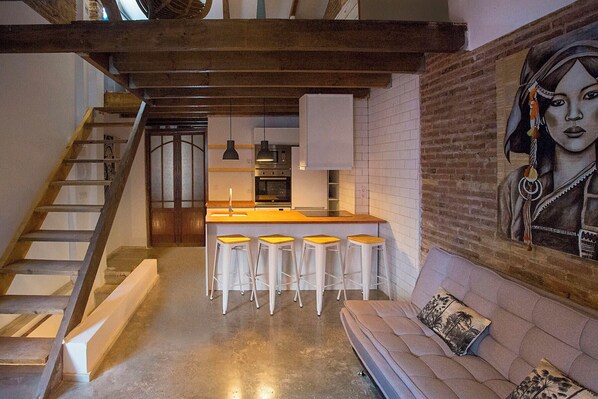 The apartment is a loft type, located on the first floor of a typical El Cabanyal house. The apartment is located on the first floor, so you need to walk stairs!