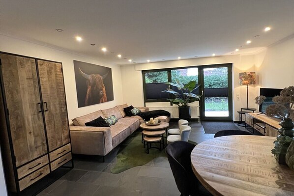 The high-quality interior includes an open living and dining area, two bedrooms, each with a smart TV, a bathroom with shower, a guest toilet and of course a fully equipped kitchen with a fully automatic coffee machine.