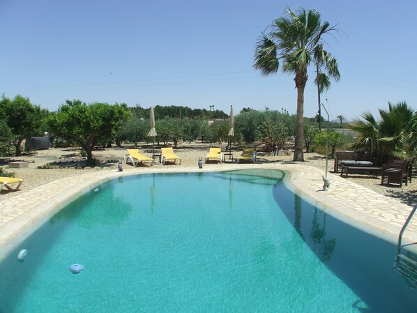 Outside there is a large table with chairs, sun umbrella and bbq. The garden is big with mainly Olive, Fig, Pomegranate, Orange and Lemon trees. The fantastic pool has enough sunbeds, umbrellas and side tables for all guests.