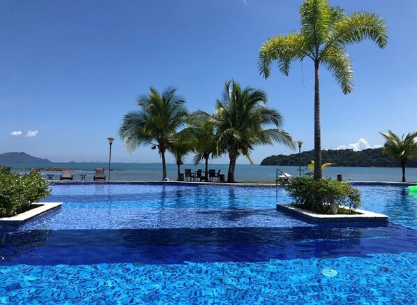 The resort is surrounded by a beautiful rainforest and natural wildlife. It is a unique tropical oasis with beachfront condominiums adjacent to a neighboring five-star hotel. The Playa Bonita Village resort is located amidst a beautiful rainforest and natural wildlife on an exclusive private beach, adjacent to the Westin Hotel and is just 15 minutes from the city. The resort enjoys beautiful views of the rainforest and the Pacific Ocean and the Panama Canal Entrance, as well as to the opposite Taboga Islands. This apartment has one bedroom, one king size bed, one complete bathroom, and a guest toilet. With direct view in the rain forest, you will have the chanche to see wild animals or many different birds just sipping a beer on your 400 sq.ft. balcony. The best place to relax, even if only 100 yards from the beach and near a 5 stars hotel that can offer you several restaurant and a beautiful terrace from which you could enjoy the sunset.