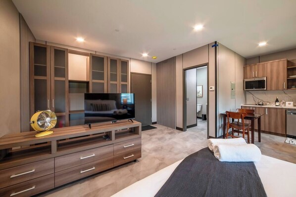 Welcome to your stylish 1-bedroom, 1-bathroom loft, thoughtfully designed for both comfort and productivity. Unwind on the plush queen bed or relax in the cozy lounge chair after a day of exploring. If you need to catch up on work, you'll appreciate the dedicated workspace. Enjoy your favorite shows on the TV, and kickstart your mornings with a fresh brew from the coffee maker, complete with a variety of complimentary tea and coffee selections.
