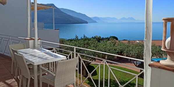 Two double bedrooms, two bathrooms, kitchen, living room with comfortable sofa bed, large private outdoor area with sea view.