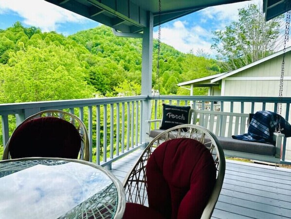Outside, guests will enjoy plenty of space to relax and enjoy the mountain views. There are 2 porches in the back, one featuring an outdoor dining area and a porch swing, and the other featuring outdoor seating off of the primary bedroom. There is a deck in the front with rocking chairs and a grill.