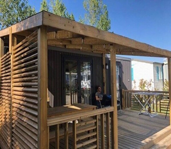 An unforgettable stay on the Jade Coast : Get ready to experience a memorable getaway on the charming Jade Coast, near Pornic, in Loire Atlantique. You will be captivated by the natural beauty of the surroundings, bordered by the Atlantic Ocean, creating the perfect setting for your vacation. ` Comfort and modernity : Your vacation space will be a premium mobile home, with an area of 34 m², offering modern comfort and a warm atmosphere. You will find all the necessary amenities to ensure your comfort, including air conditioning for pleasant nights despite the summer heat. ` Entertainment and relaxation : Your stay will be even more enjoyable thanks to the included television and wifi, perfect for your moments of relaxation and entertainment. In addition, this mobile home can accommodate up to 4 adults and 2 children under 10, with a fully equipped kitchen, a master bedroom, a children's bedroom, a living room with a sofa bed, a bathroom, and separate toilets. You won't be able to resist the temptation of living a luxurious, relaxing, and fun vacation experience near Pornic. Book now to provide your family with unforgettable memories. And remember, even if you forget your toothbrush, you will never forget your stay with us! ` camping les chenes verts - Mobil Home Prestige 4/6 Places Options & Services : - Lodging Deposit: Compulsory : from 400€ per stay (Pour toute location de Mobil home, la caution est de 400€. Elle comprend les frais de ménage (90€).Cette caution peut-être donnée par chèque ou par emprunte de carte bancaire. Elle sera restituée ou détruite dans les 8 jours après votre départ Caution camping: Nous acceptons les groupes de jeunes mais une caution de 180 € vous sera demandée et peut être encaissée en cas de bruits déraisonnables et répétés occasionnés sur le terrain (Une caution par emplacement). En cas d’expulsion avant la fin du séjour, celui-ci ne sera pas remboursé.) - Cot: Optional : from 2€ (2€/ nuit mais stock limité) - outdoor parking space: Included in the price - Shared pool: Included in the price - -Swimming pool opening dates : 01-01 to 31-12 (La piscine couverte est ouvert du 6 avril au 15 Septembre La piscine extérieure est ouverte du 1er juillet au 31 aout) - Television: Optional : from 39€ per week (Elle est inclus dans la gamme prestige, premium et luxe) - Wifi: Optional : from 10€ per week (Elle est inclus dans la gamme prestige, premium et luxe 3€/jour 10€ la semaine et 16€ les 14 jours) - Pets allowed: Paid service (rates available on site) (5 euros) - Arrival time: 15H00 - 19H00 - Departure time: 10H00 - Final cleaning: Optional : from 90€ per stay - Towel: Paid service (rates available on site) (8 euros (une grande serviette et une petite serviette)) - Bed linen: Paid service (rates available on site) (12 euros) ` Guests of this establishment must clean the accommodation or subscribe to an additional service before the end of their stay. An extra charge may be applied by the establishment in case of non-compliance. Unless otherwise indicated by the establishment, guests must bring their own sheets and towels for their stay. A kit can be provided by the establishment at an extra cost and subject to availability. Please contact the establishment for any requests. This establishment is a campsite with a tourist purpose. Please contact us in advance if you wish to make a reservation for a business trip.