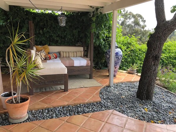 The back deck is perfect for barbecues, with a gas grill, picnic table, and a custom-built outdoor daybed surrounded by passion fruit vines. Below the deck you'll find a grassy lawn with a trampoline and fruit trees.