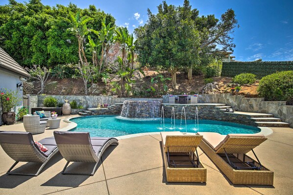 Escape to Château Vista in Vista, where you can unwind by the resort-style pool area with solar heating, salt water features, and a raised spa with waterfall. Inside this luxurious retreat, enjoy entertainment options like the game room and arcade or home-cooked meals on the grill while taking in west-facing views overlooking mountains and sunsets. Modern amenities include high-speed Wi-Fi throughout and smart TVs for streaming your favorite shows.
