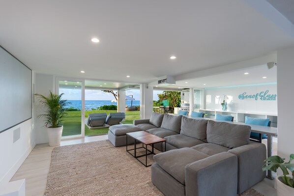 The media lounge is an open living room on the ground level. There is a U-shaped RH cloud sectional facing the 110” projector screen for watching movies or your favorite team play. Behind the sofa is bar height seating for 6. Stacking patio doors lead out to the lower level lanai, bbq, grassy yard and beach access.