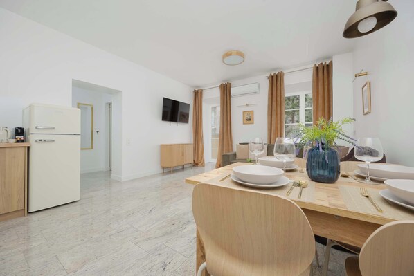 The first-floor apartment can accommodate up to 4 people and is an excellent choice for couples and families looking for a comfortably furnished space to relax. The interior, decorated in light colors, was designed with comfort in mind, and wooden accents highlight the apartment’s charm. The spacious living room features a sofa bed, which, in addition to serving as a place to relax during the day, can also provide an extra sleeping spot. Next to it is a bean bag chair, and across from it is a large TV to keep you entertained in the evenings. Additionally, the room is equipped with air conditioning. The room also features access to a furnished terrace, where you can relax outdoors. The kitchenette is equipped with functional appliances, including an induction cooktop, an oven with a microwave function, and a toaster, allowing you to easily prepare a wide variety of dishes, from quick snacks to home-cooked meals. The space is complemented by a dining table where you can comfortably enjoy your meals. The apartment is equipped with a foldable crib and a high chair. In the bright bedroom, a double bed ensures a peaceful night’s sleep. There is also a second TV, as well as a chair and a desk, allowing you to comfortably continue working or studying. The bathroom features a shower, soft towels, and a set of complimentary toiletries. An added bonus is the in-apartment washing machine, which is especially useful during longer stays. Additionally, pets are welcome.